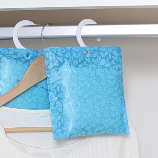 商品名:ドライ&ドライ カラッとドライ 吸湿パック 10個組 サイズ:約19.5×19.5cm(フック除く) カラー:ライトブルー 柄:ボタニカル柄 内容:10個 材質:ポリプロピレン・ポリエステル・合成繊維(アクリレート系) 生産国:中国