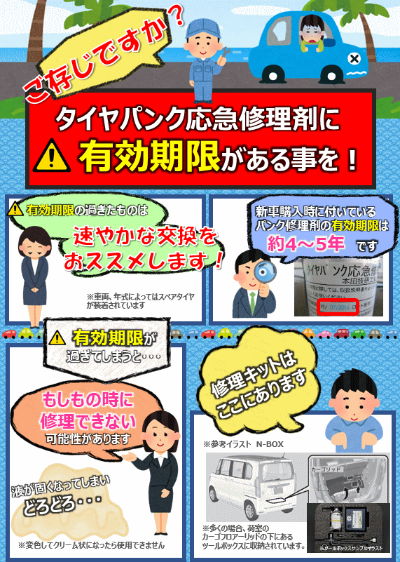 | ホンダ純正品 ご存知ですか? タイヤパンク応急修理剤に有効期限があることを! 有効期限の過ぎたものは、速やかな交換をおススメします! ※車両、年式によってはスペアタイヤが装着されています。 新車時に付いているパンク修理剤の有効期限は約4〜5年です。 有効期限が過ぎてしまうと・・・ もしもの時に修理できない可能性があります。 液が固くなってしまいどろどろ・・・ 修理キットの多くは、荷室のカーゴフロアーリッドの下にあるツールボックスに収納されています。 |
