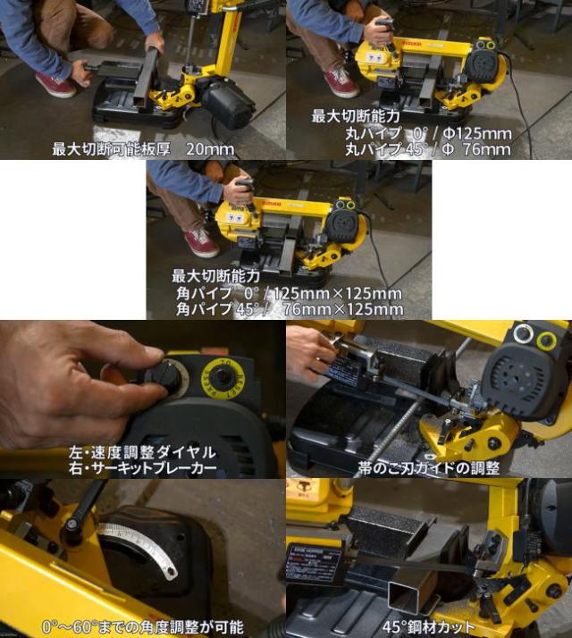 | 仕 様 | ・定格入力電圧:単相100V ・定格周波数:50Hz/60Hz ・切断能力:本体角度0度:丸パイプ φ128mm / 角パイプ 幅125mm×高さ125mm 本体角度45度:丸パイプ φ76mm / 角パイプ 幅76mm×高さ125mm 本体角度60度:丸パイプ φ45mm / 角パイプ 幅45mm×高さ125mm ・可動域:0〜60度 ・周 速:38〜80m/min ・刃のサイズ:1435×13×0.65mm 14/18山 ・ケーブル長:電源ケーブル1.9m ・本体寸法:幅715mm×奥行355mm×高さ440mm ・質量21kg |