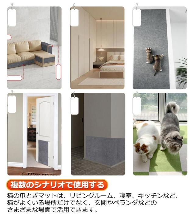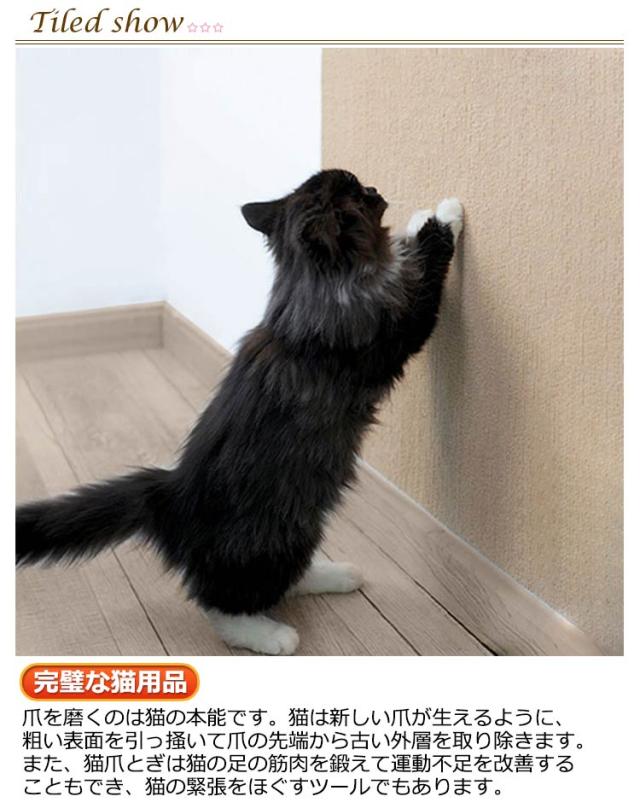 | 【素材】猫用爪とぎマットはポリエステルで作られており、耐摩耗性があり環境に優しいため、理想的な爪とぎ材です。猫に楽しく快適な爪とぎ体験を提供すると同時に、家の家具や床、壁の保護にも役立ちます。 【ソファーや家具の保護】壁、ドア、ソファー、家具などに貼ることで、猫の爪とぎから大切な家具を守ります。 【DIYでの組み立てと切断】猫用の爪とぎマットは、DIYで自由に裁断し、必要に応じて組み立てることができます。そのため、異なるサイズや形に合わせて利用することができ、猫の健康を守りながら、家具や床などの表面を保護します。この柔軟性と便利さは、猫と飼い主の両方にとって利点です。 【完璧な猫用品】爪を磨くのは猫の本能です。猫は新しい爪が生えるように、粗い表面を引っ掻いて爪の先端から古い外層を取り除きます。また、猫爪とぎは猫の足の筋肉を鍛えて運動不足を改善することもでき、猫の緊張をほぐすツールでもあります。 【滑り止め底部】猫スクラッチマットの背面は、安定性を提供し、マットが動くのを防ぐように設計された滑り止めデザインを備えています。滑り止めの底により、マットが床やソファにしっかりと固定されるため、猫が引っ掻いているときに滑って家具を誤って傷つける心配がありません。 【複数のシナリオで使用する】猫の爪とぎマットは、リビングルーム、寝室、キッチンなど、猫がよくいる場所だけでなく、玄関やベランダなどのさまざまな場面で活用できます。 | |