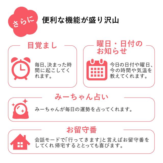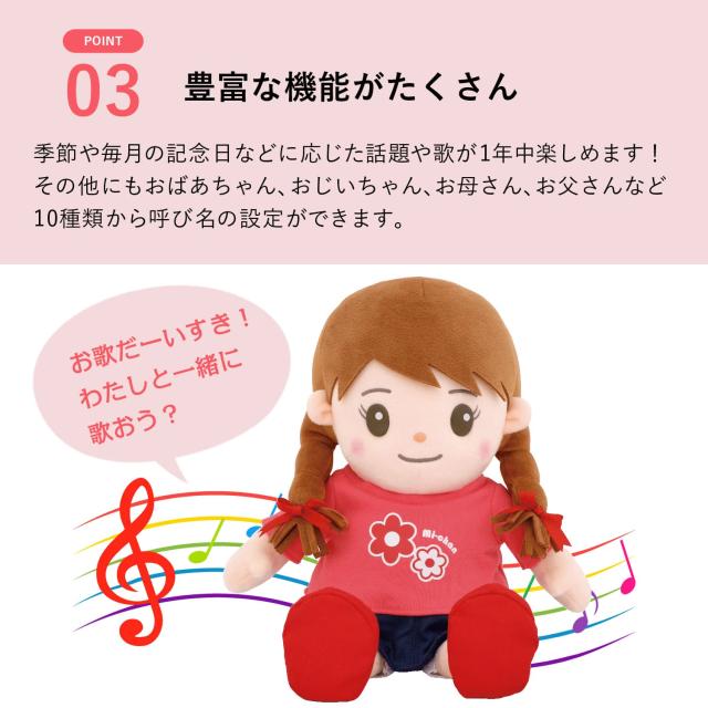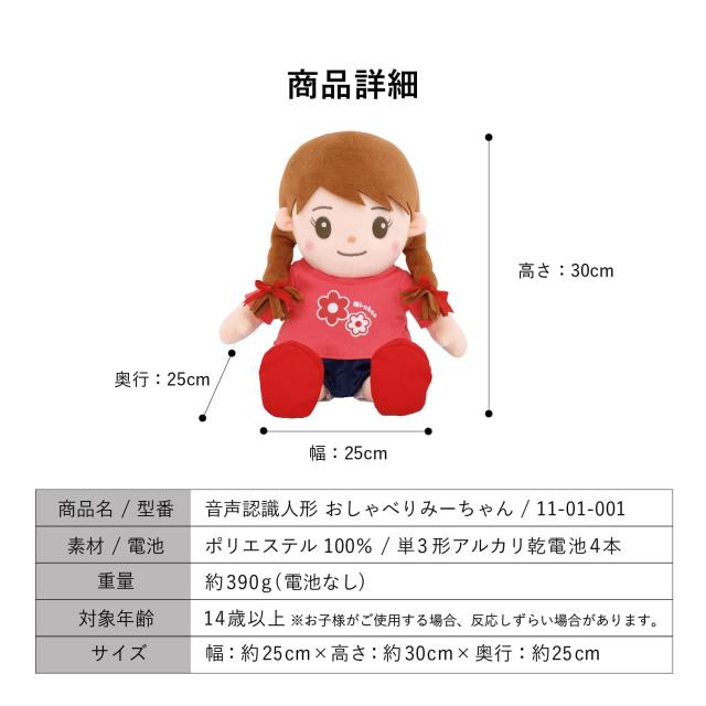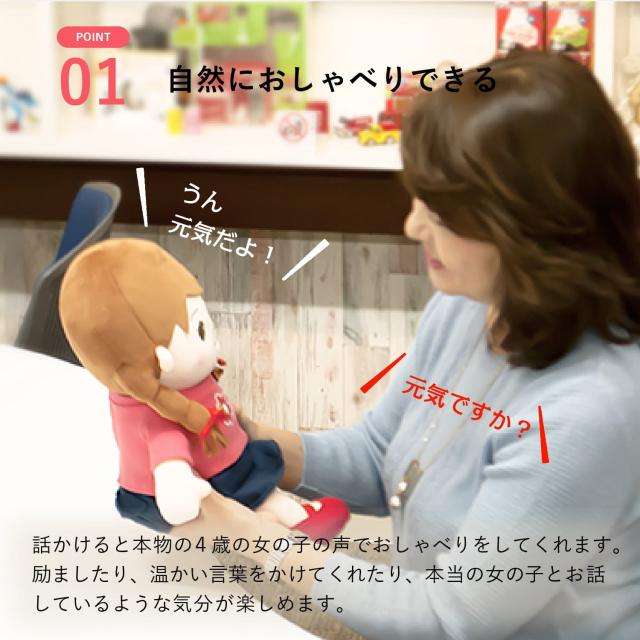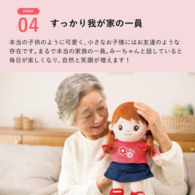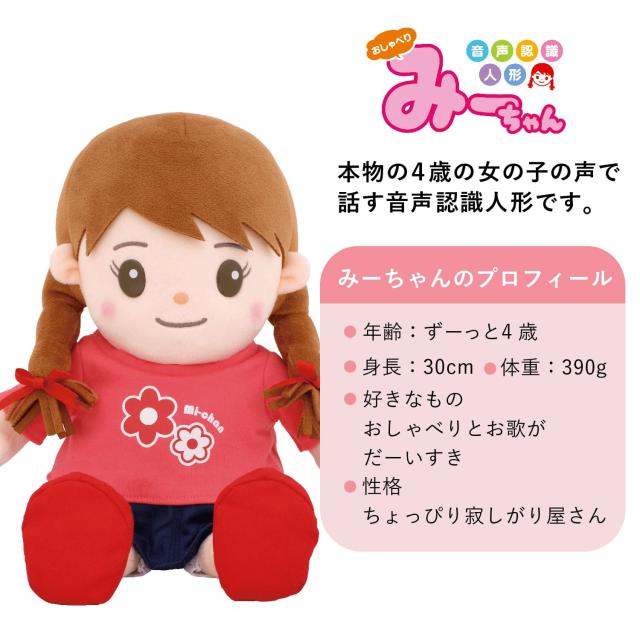 メディアでも取り上げられた、今話題の「おしゃべりみーちゃん」!本当の4歳の女の子の声でおしゃべりする、可愛い音声認識人形です。会話はもちろん、季節ごとの歌を歌ってくれたり、可愛いひとりごとで語りかけてくれたり、あなたの暮らしを明るくしてくれ心を和ませてくれます。