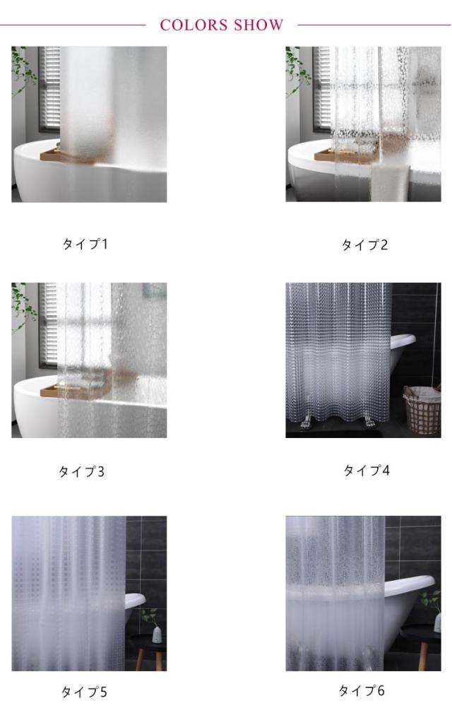 | サイズについての説明 | 【仕様】シャワーカーテン×1枚 (フック付き)サイズ:幅100×高さ180 幅120×高さ180 幅120×高さ200 幅150×高さ180 幅150×高さ200 幅180×高さ180 幅180CM×高さ200CM |