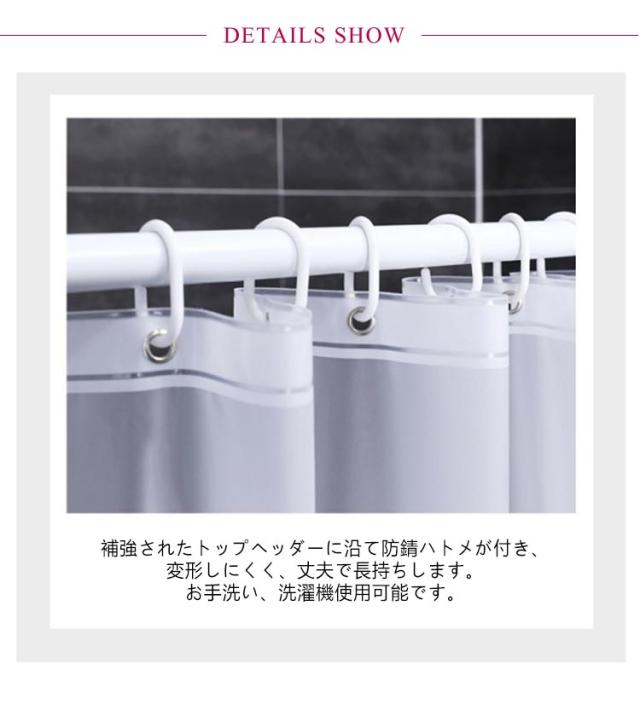| 【幅180×高さ180】 【幅180CM×高さ200CM】 表面には3D立体特別加工でオシャレでバスタイムを楽になります。 シャワーカーテンは半透明状で、シャワーカーテンの表面は特殊な加工を経て、遮眼効果が良好で、プライバシーを有効に保護することができます。 光を照らしたら、ピカピカして見え、とてもローマン断熱性がよく、部屋暖房ロス抑制、保温効果があり、寒い冬でも安心できるバスカーテン。 カーテンフックが付いているので取り付けてやすく、すぐに使えます。補強されたトップヘッダーに沿て防錆ハトメが付き、変形しにくく、丈夫で長持ちします。お手洗い、洗濯機使用可能です。 | |