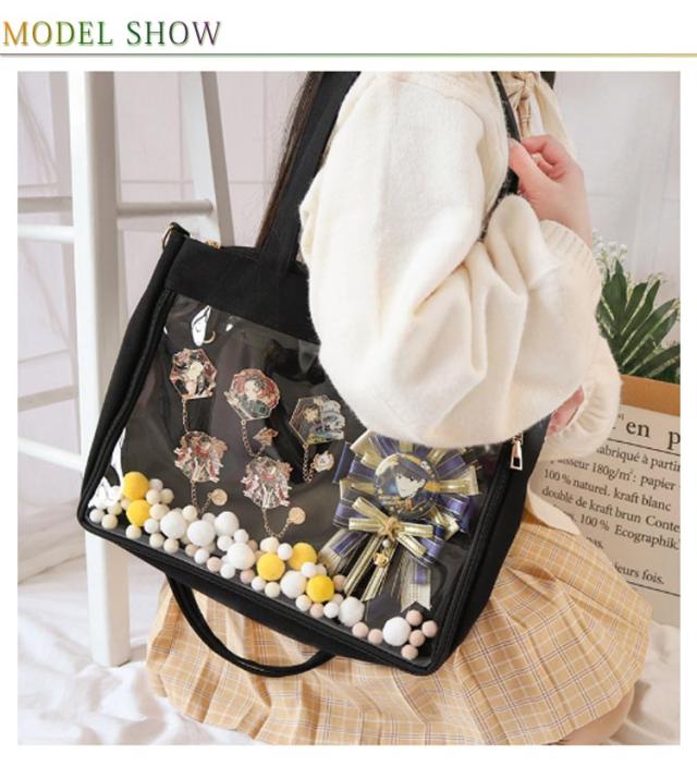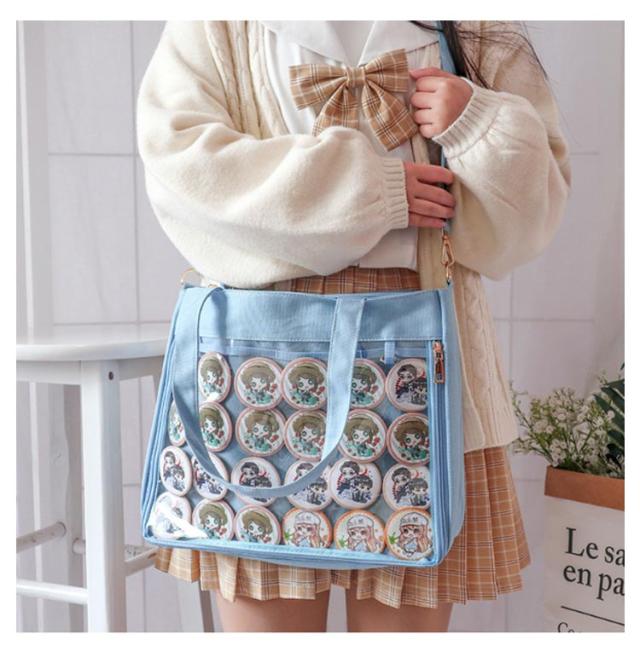 | 自分のコレクションを持ち歩けるバッグです。マイコレクションをオシャレに持ち歩きましょ♪バッグの透明ポケットで見せたいアイテムで自分の好みにアレンジできま バッグの片面の透明ポケットで見せたいアイテムで自分の好みにアレンジできます。 好きな芸能人やアニメキャラの写真、缶バッジ、ストラップ、ぬいぐるみ、萌グッズなど入れて一目瞭然です。 | |