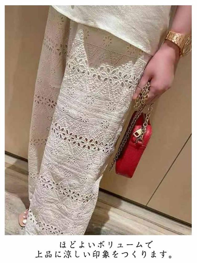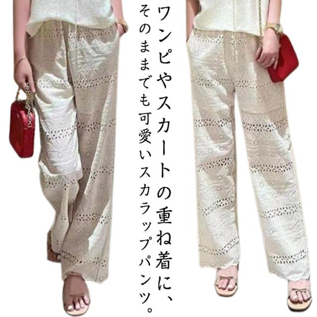 レースパンツ スカラップ レイヤード レース スカラップパンツ ワイドパンツ ナチュラル レース ホワイト 白 総レース ロングパンツ ロング丈 ゆったり スカラップパンツ おしゃれ 可愛い