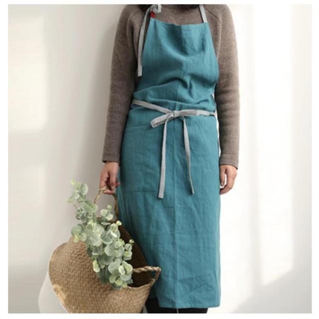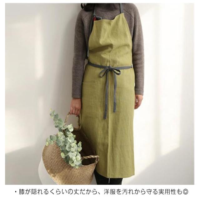 | ・リネン素材のおしゃれなエプロン ・首にかけるタイプの肩紐は、細めで華奢な印象に。 ・着け心地が良く、キッチン仕事以外にも、家事全般に重宝します! ・膝が隠れるくらいの丈だから、洋服を汚れから守る実用性も◎ | |