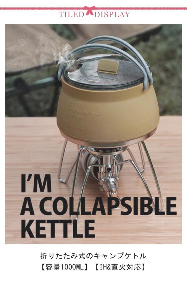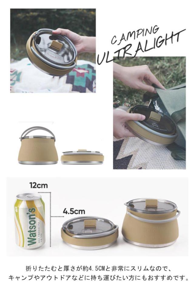 | 折りたたみ式のキャンプケトル 【容量1000ml】【IH&直火対応】 耐熱800℃!底部がステンレス製となっておりますので加熱はもちろんOKです。 折りたたむと厚さが約4.5cmと非常にスリムなので、キャンプやアウトドアなどに持ち運びたい方にもおすすめです。 シリコン製で超軽量!キャンプだけでなく、登山やサイクリングにもおすすめ! 1000ml入る大容量!3人以上のキャンプでも満足できます。 | |