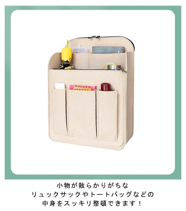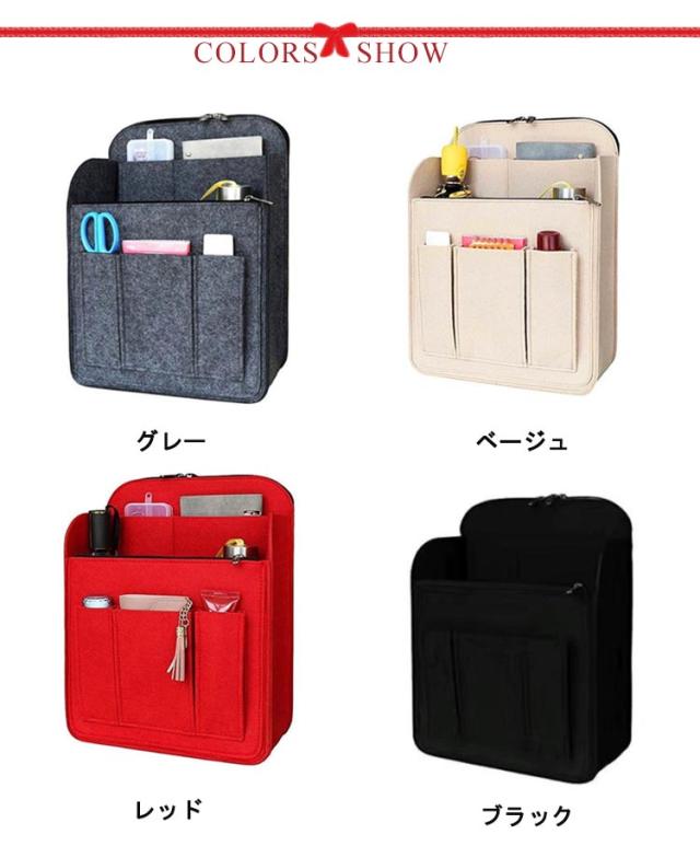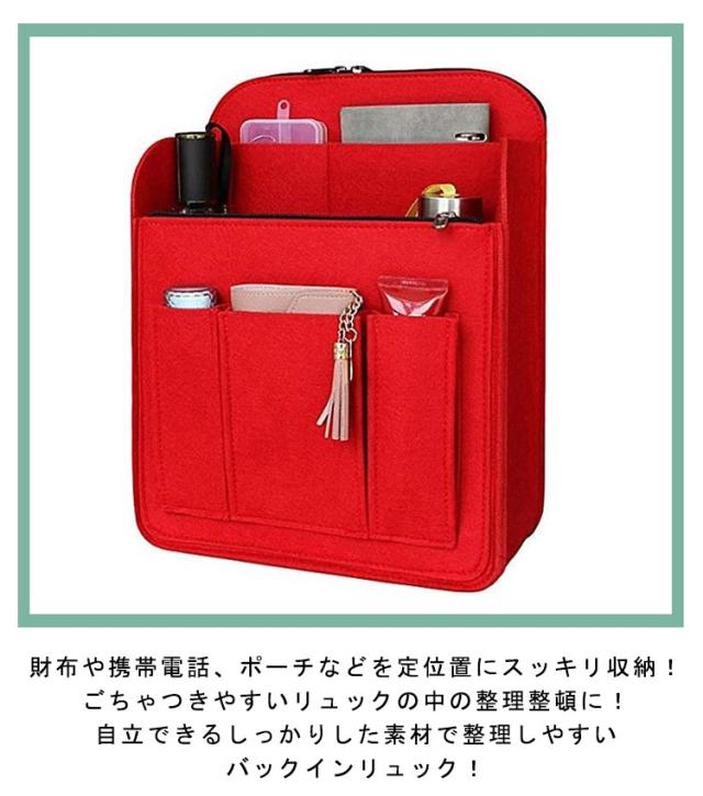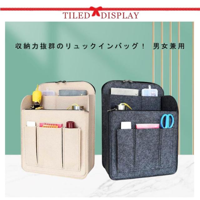 | 収納力抜群のリュックインバッグ! 男女兼用 小物が散らかりがちなリュックサックやトートバッグなどの中身をスッキリ整頓できます! 広めのマチでたっぷり収納できるバッグインバッグ!雑誌やタブレットの持ち運びにも最適なバックインリュック!A4サイズも収納できてとっても便利なインナーバッグ! 財布や携帯電話、ポーチなどを定位置にスッキリ収納!ごちゃつきやすいリュックの中の整理整頓に! 柔らか素材のフェルトでできており、荷物に傷がつきにくく、優しく整理整頓いたします。 自立できるしっかりした素材で整理しやすいバックインリュック! | |