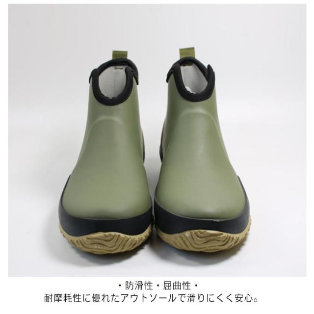 | ・晴れの日、雨の日に使える万能レインブーツ ・スポンと履けるショート丈タイプ ・大きめの履き口で着脱もラクラク。履き口にはループ付き。 ・防滑性・屈曲性・耐摩耗性に優れたアウトソールで滑りにくく安心。 ・雨天時のジョギング、ウォーキング、アウトドアでの活動、ガーデニングに最適な一足です。 | |