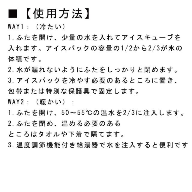 | 膝サポーター 氷嚢(氷のう)付き 【圧迫力の調整がしやすい】調節がしやすいマジックテープ設計で体型にフィットしやすいです。あらゆるスポーツのトレーニングや競技後のクールダウンに!! 【対応部位】 ヒジ・ヒザ・太もも・足首・手首などに 【保冷/保温両用の氷嚢(氷のう)付き】保冷効果を逃がさず、長時間のアイシングが可能です。ホットバック55℃以下のお湯を用いて、温熱アイスバッグにもお使いいただけます。 【水漏れ防止】アイスバッグの裏に高品質なポリウレタンコーティング加工され、キャップがしっかり密封で、水漏れがありません。それに、表に結露と水滴が生じにくく防湿加工で、結露もなくて、楽しく使えます。 ■【使用方法】 Way1:(冷たい) 1.ふたを開け、少量の水を入れてアイスキューブを入れます。アイスパックの容量の1/2から2/3が氷の体積です。 2.水が漏れないようにふたをしっかりと閉めます。 3.アイスパックを冷やす必要のあるところに置き、包帯または特別な保護具で固定します。 Way2:(暖かい): 1.ふたを開け、50〜55℃の温水を2/3に注入します。 2.ふたを閉め、温める必要のあるところはタオルや下着で隔てます。 3.温度調節機能付き給湯器で水を注入すると便利です | |