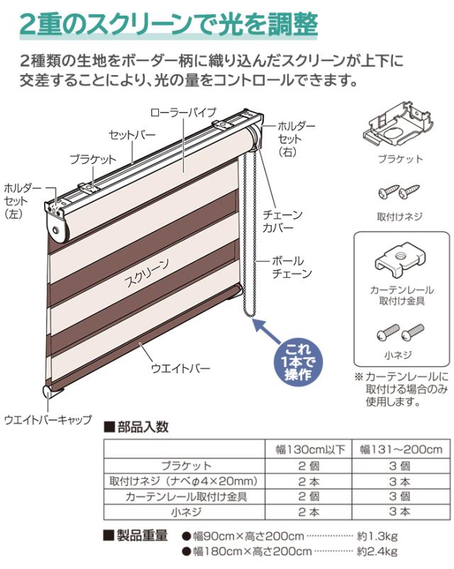2種類の生地をボーダー柄に織り込んだスクリーンが上下に交差することにより、光の量をコントロールできます。