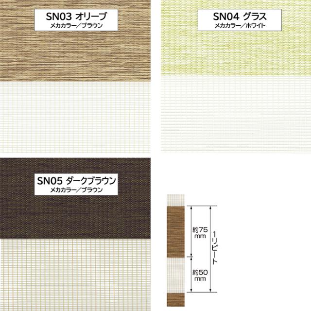 SN01アイボリー(メカカラー:ホワイト)、SN02ブラウン(メカカラー:ブラウン)、SN03オリーブ(メカカラー:ブラウン)、SN04グラス(メカカラー:ホワイト)、SN05ダークブラウン(メカカラー:ブラウン)