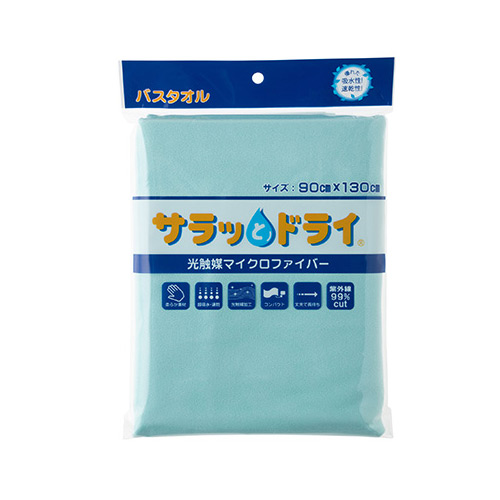 「サラッとドライ 無地バスタオル 80cm×140cm ミント ASK-1L-MNT」は、既存の90×130cmよりさらに使いやすくなった新サイズのバスタオルです。「サラッとドライ」は、抜群の吸水性に光触媒加工を施したタオルです。薄くて軽く、かさばりません。高速で大量の水分を吸収。驚きの速乾性で、冬場や梅雨時の洗濯のストレスもありません。光触媒により抗菌・消臭性に優れています。砂が付きにくいので海水浴にもオススメです。