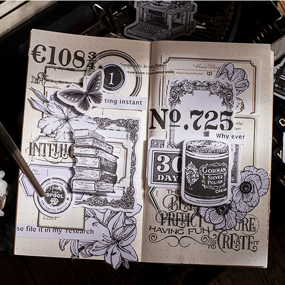 コラージュ素材 シール 大きめ 50枚50柄 レトロ マステシール 白黒 線画 モノトーン 手振り 英字 数字 ナンバー 枠 タイプライター フレーム 文房具 雑貨 小物 手紙 本 万年筆 ラベル ステッカー シール アンティーク 海外 コラージュ 素材 デコレーション 手帳 DIY