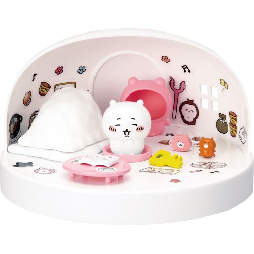 ●半ドーム型のおうちの中には8つのかわいい小物があるよ。原作やアニメにも登場する、おうちのかぎやくまのぬいぐるみ、いつもちいかわががんばって勉強をしている机とノート、もこもこのおふとんと、ポシェットの鎧さんお手製のポシェットやパジャマまで!