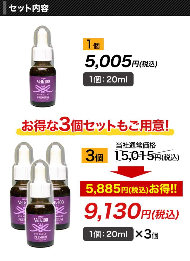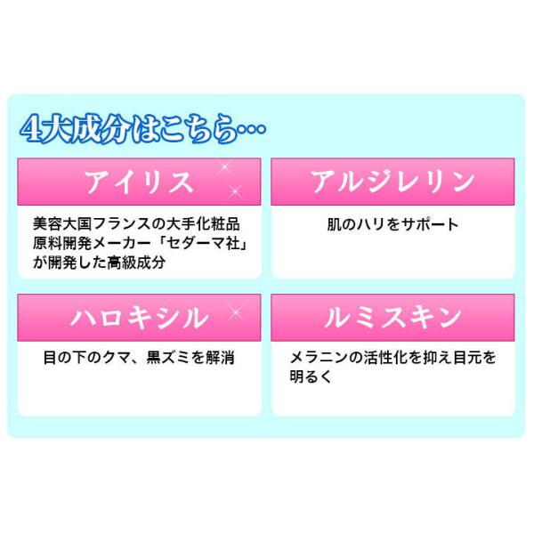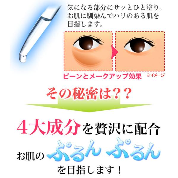 使用方法 | よく振ってから洗顔後、適量(1〜2滴)を指先に取り目の下の気になる部分に塗って下さい。その後化粧水、乳液等で通常のお手入れを行って下さい。 |
