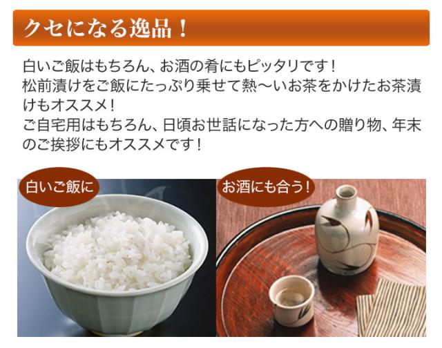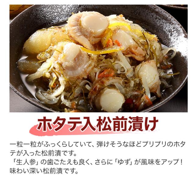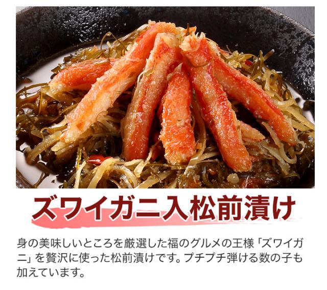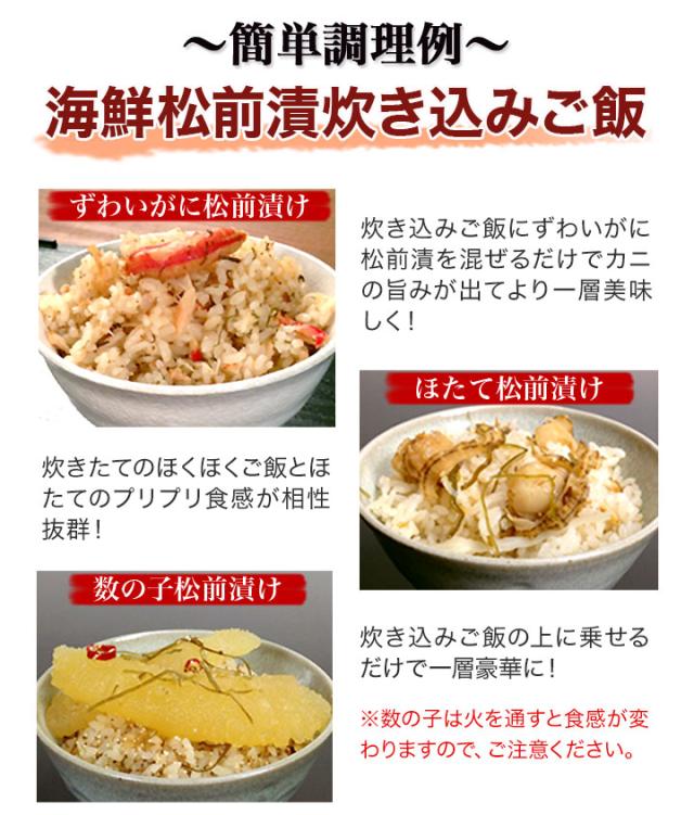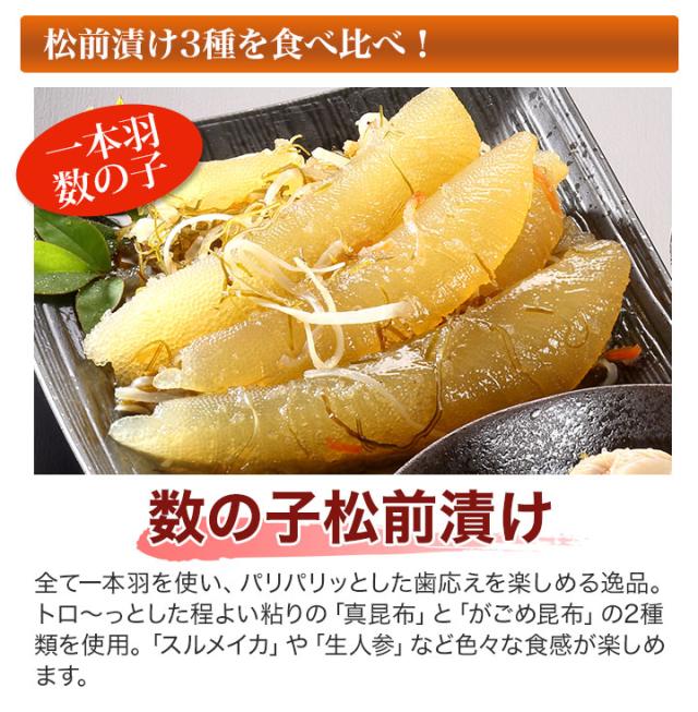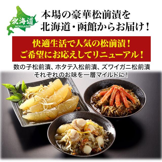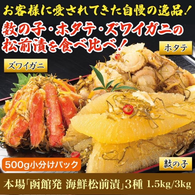 セット内容 | 1.5kg:数の子松前漬500g、ズワイガニ入松前漬500g、ホタテ入松前漬500g |