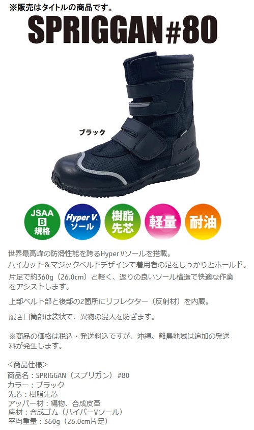 日進ゴム SPRIGGAN #80 ハイパーVソール搭載 26.5cm 黒 作業靴 先芯無し ワークシューズ ブラック BLACK 送料無料