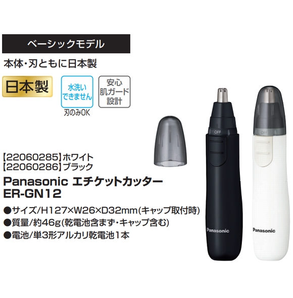 | 商品名 | パナソニック エチケットカッター ER-GN12 ブラック:JAN:4549980800904 ホワイト:JAN:4549980800911 | ||