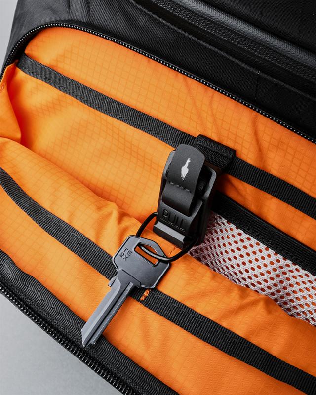 | マグネット式のキーテザーを搭載。バッグの中で迷子になりがちな鍵管理に最適。 | ショルダーベルトにはフックなどをかけられるスペースを設けています。 |
