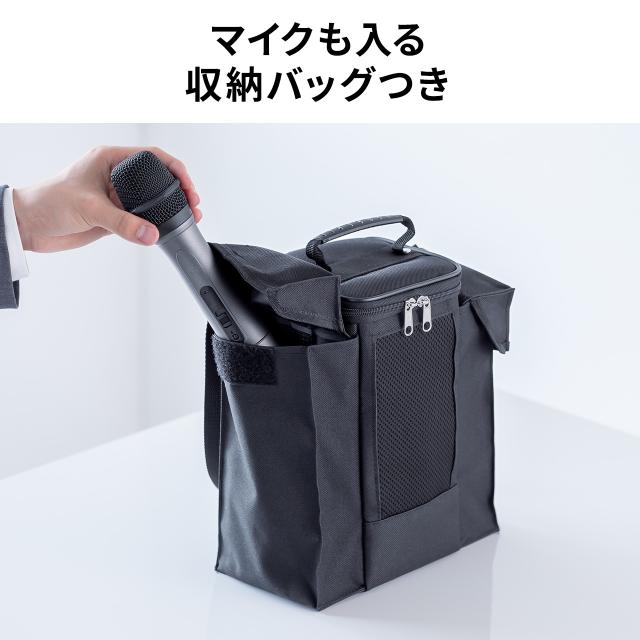 ■セット内容:スピーカー本体×1、ワイヤレスマイク×1、有線マイク(ケーブル付属)×1、取扱説明書×1、収納バッグ×1、ACアダプター(DC12V 2A)×1、マイナスドライバー×1