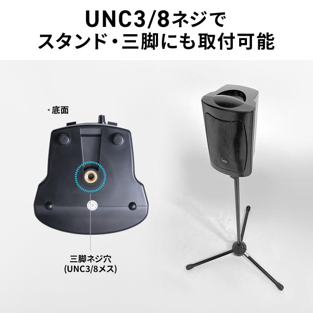 ●本体下部には音響用スタンドが取り付けられる三脚ネジ穴(3/8-16UNC)を搭載しています。三脚を取り付けてスタンド付スピーカーとして使用することもできます。