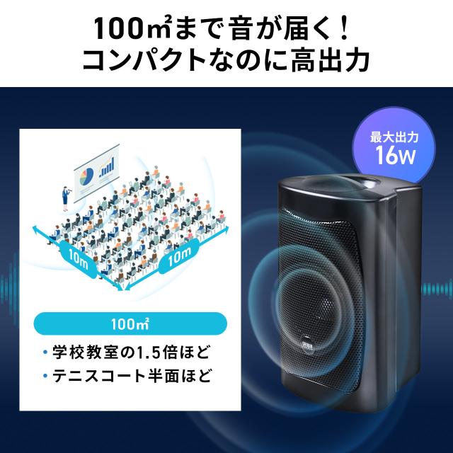 ●スピーカー出力は最大16Wの高出力で屋内環境で約100平方メートル程度での使用に最適です。