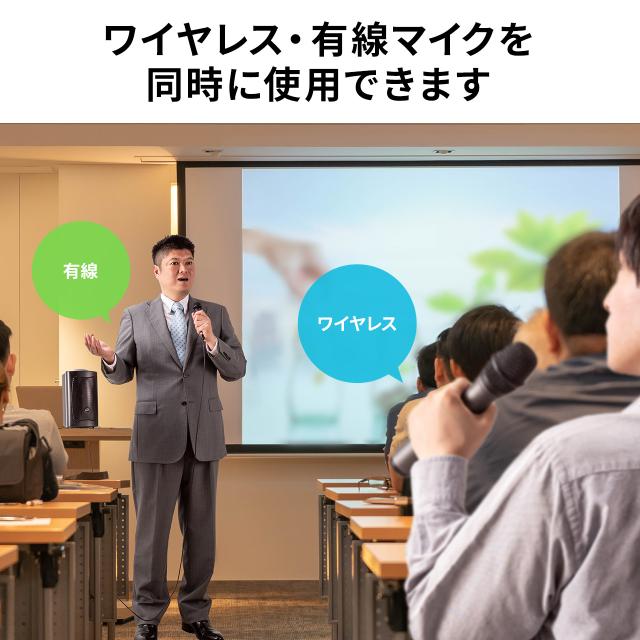 ●ワイヤレスマイク、有線マイクが各1本同梱されており、利用シーンによって様々な使い方が可能です。