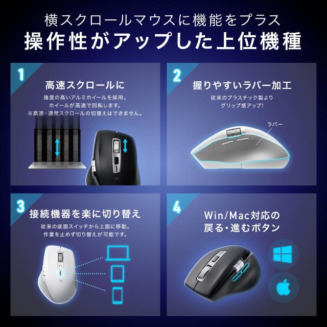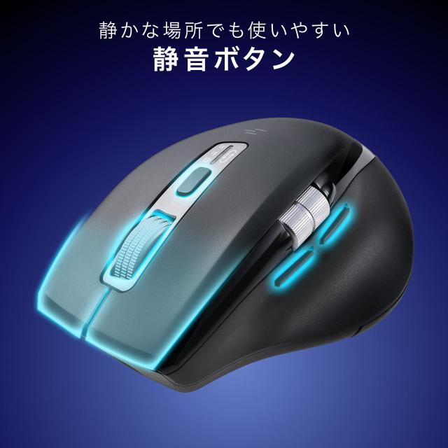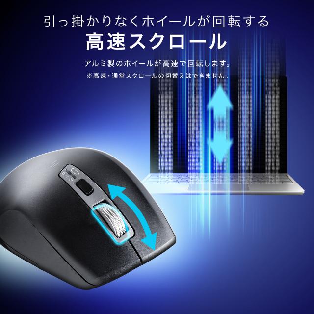 ⇒ご購入の前にご確認下さいサイドホイールと高速スクロールが搭載されたBluetoothマウス。ホイールにはアルミを使用し、上質な仕上がり。Bluetoothと2.4GHzワイヤレスの両対応。静かな場所でも使える静音ボタン。ラバー加工がなされたエルゴノミクス形状で操作しやすい。ブラック。【WEB限定商品】
