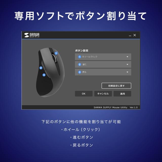 ■ボタン:左・右クリック、ホイール(スクロール)ボタン、サイドホイール、戻るボタン、進むボタン、接続切替えボタン、Windows/Mac切替えボタン