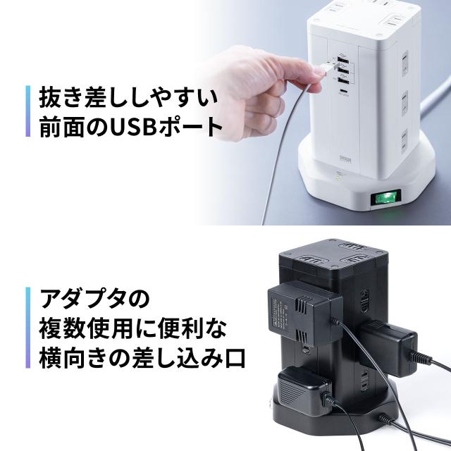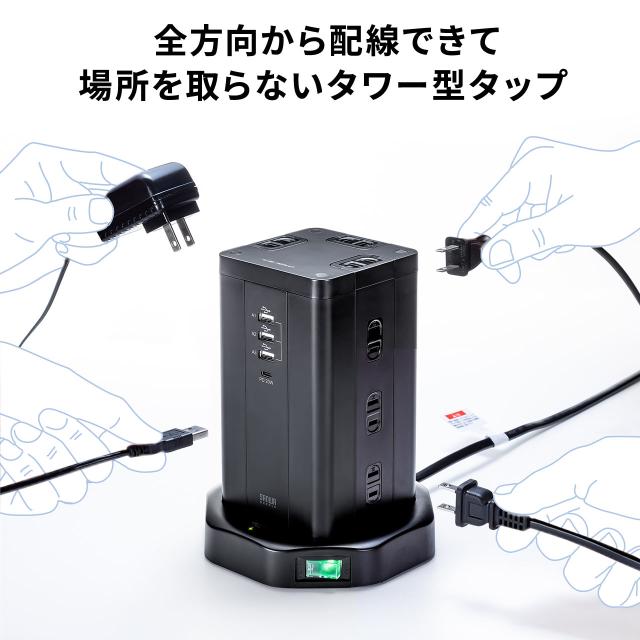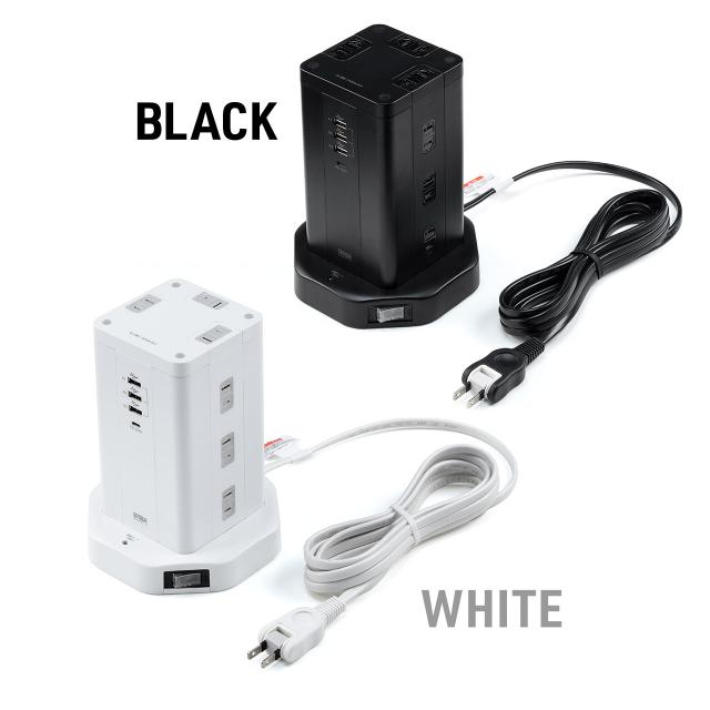 電源タップ タワー 12個口 PD 20W対応 USB-A×2ポート USB-C ×1ポート 2m 一括スイッチ付き スイングプラグ USB充電 延長コード ブラック ホワイト[700-TAP074]