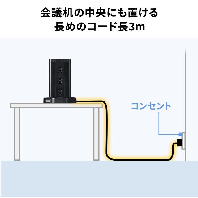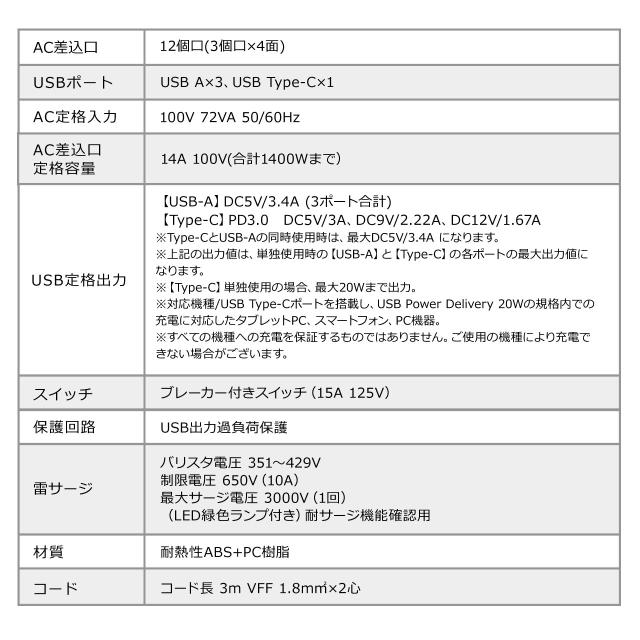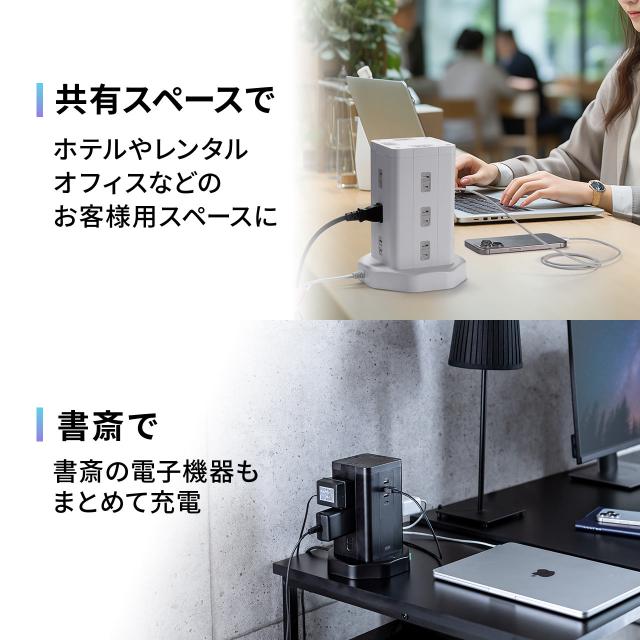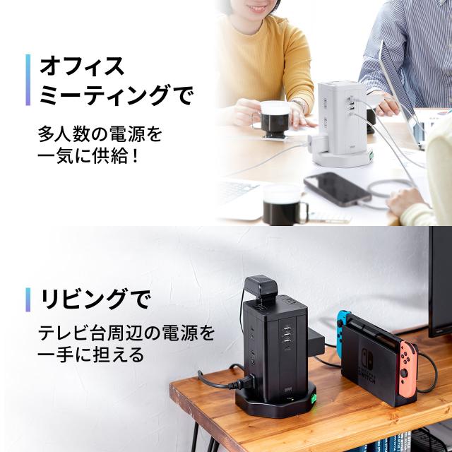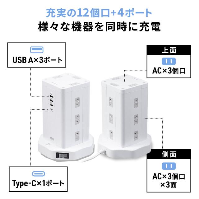 ●タワー型で差込口が上面に3個と側面に3方向3個の口(合計12個の口)が並んでいるため、どこからでも差し込むことができ便利です。●USB Aポートが3ポート(合計3.4A)、Type-Cポート(PD20W)が1ポートあり、タブレットやスマートフォンの充電ができます。