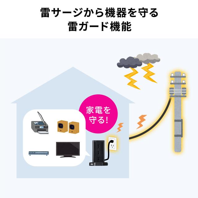 ●雷ガード機能も搭載されており、内蔵された吸収素子が雷サージを吸収し接続機器を守ります。