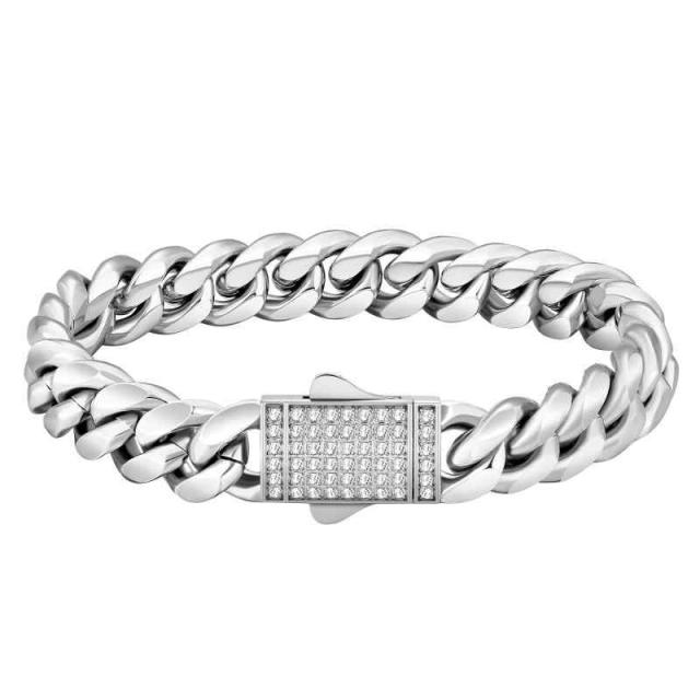 【B系アクセの定番】B系アクセの人気デザイン、幅12mmの喜平ブレスレット。通常の喜平チェーンとは少し違い、留め具部分に無数のCZダイヤを散りばめております。シンプルながらも重厚感があり、定番ブレスに物足りなさを感じている方にぜひお勧めしたい一品です。