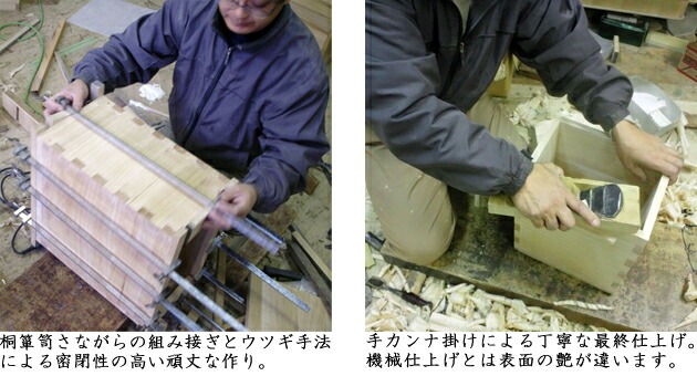 越後米蔵がご提案する桐製米櫃(こめびつ)の特徴は、厚さ約1.5センチの厚板と高級桐箪笥の伝統工法そのままに、伝統工芸士の手で一つ一つ丁寧に組み上げられた芸術作品でもあるのです。そして、使用する材料は伝統工芸士が新潟県中魚沼郡津南町で立木を直接買い付けた正真正銘日本桐なのです。 【安心安全な米由来の接着材使用】 米びつを作るにあたって合成接着剤のボンドを使わずお米を煮て練り上げた続飯(ソクイ)で製作しています。 続飯の歴史は古く枕草子にも「遠き所より思う人の文を得て固くとじたる続飯など開くるほどいと心もとなし」 (訳:愛する人の手紙を貰ってソクイの封を開けるのもじれったい)とあるように昔からの接着剤としてボンドに負けない接着力を有しています。 当店の米櫃は化学物質は一切使用していない、自然由来の安心安全な米櫃です。