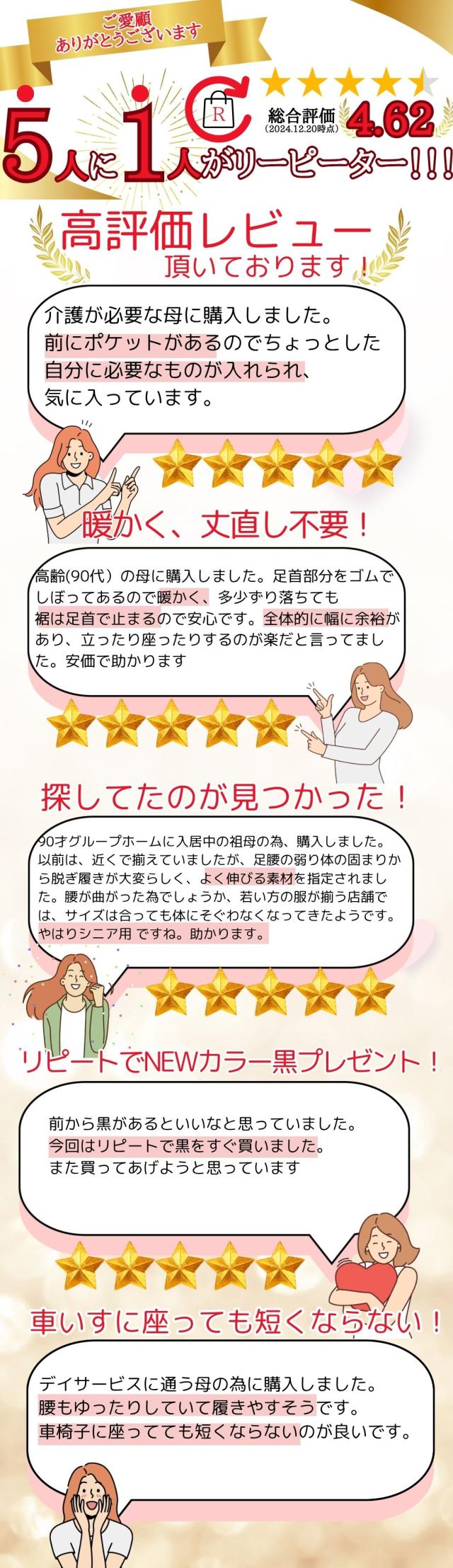 - 背の小さい母親用に購入。足首がゴムなので履きやすいみたいで良かったです。