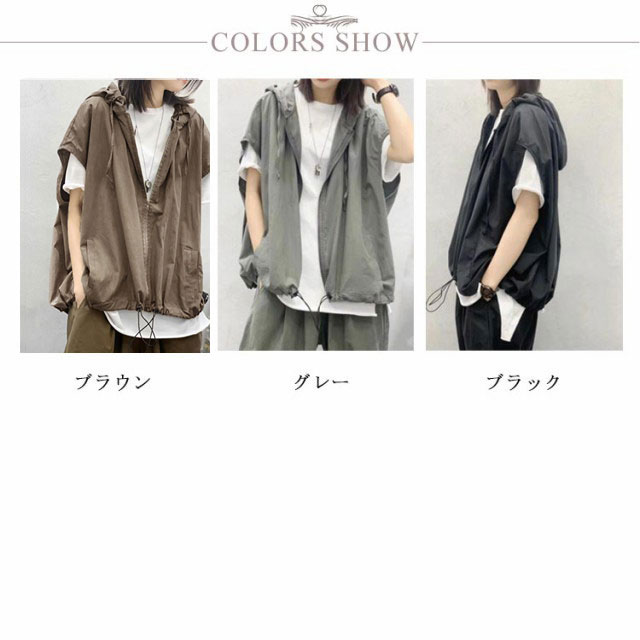 | 3色×6サイズ フロントジッパー式フード付き半袖ベスト | |