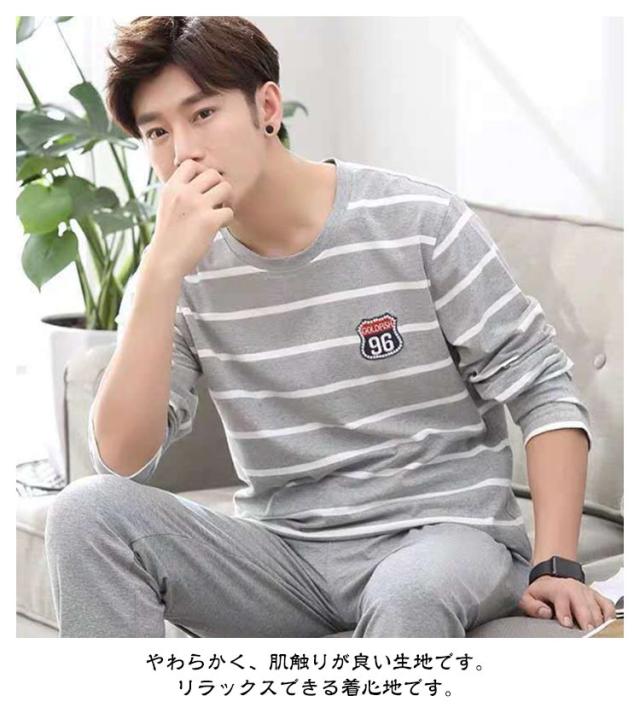 パジャマ メンズ 長袖 春 夏 薄手 Tシャツ 上下セット ルームウェア 柔らか 軽い 快適 寝間着 ボーダー 春夏秋 セットアップ リラックスウェア 長袖Tシャツ 長ズボン 部屋着 シンプル 男性 父の日 プレゼント 敬老の日