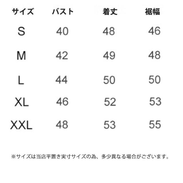 | サイズについての説明 | サイズ バスト 着丈 裾幅 ※サイズは当店平置き実寸サイズの為、多少異なる場合がございます。 |