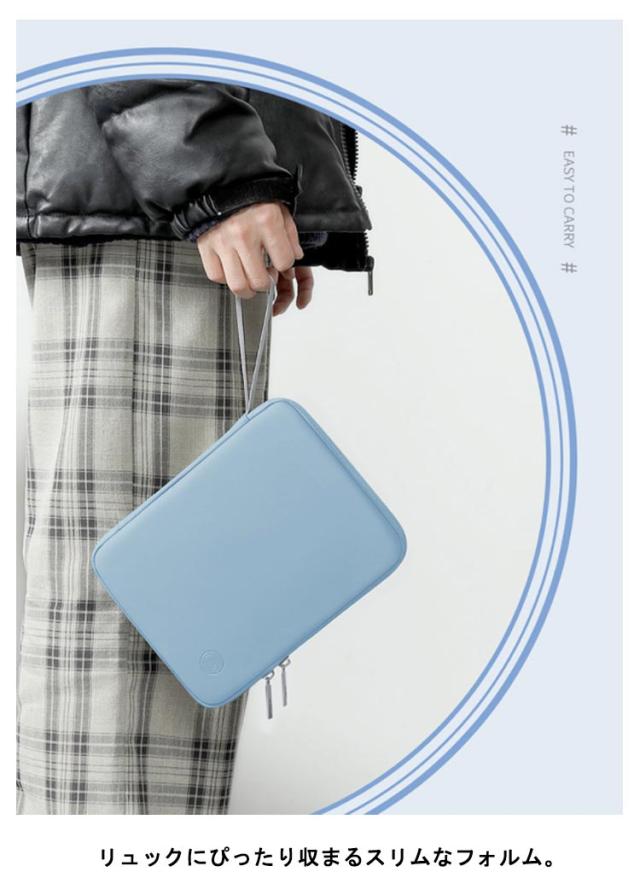 | タブレットやモバイルアクセサリーをスッキリ整理整頓できる、持ち運びも安心なタブレットケース。 リュックにぴったり収まるスリムなフォルム。 | |