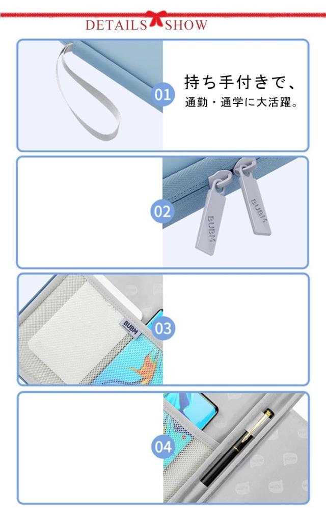 | サイズについての説明 | 10.9インチ:横21x縦28xマチ2cm 12.9インチ:横23x縦31xマチ3cm |