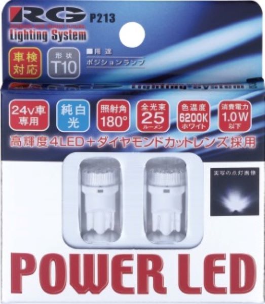 レーシングギア(RG) パワーLEDバルブ 6200K白色光 T10 24V用 1.0W ウェッジタイプ 入数:1セット(2個入) RGH-P213 外装 外装パーツ エクステリア ライト ランプ ポジション灯 ポジションランプ ナンバー灯 ライセンスランプ ライセンス 車幅灯 車幅 ポジション球 内装 内装パーツ インテリア ルームランプ ルームライト ROOMLAMP Room lamp 室内灯 リーディングランプ マッピングランプ 車内灯 ルームランプ球 ルーム球 ラゲッジ ラゲッジルーム 荷室 荷台 照明 取り換え 交換 加工 改造 アクセサリー カーアクセサリー カー用品 カスタマイズ カスタム パーツ ドレスアップ 純正球 そのまま交換 LEDバルブ 高輝度 4LED ダイヤモンドカットレンズ 24V車 車検対応 ポジション 25lm 25ルーメン 6200ケルビン 白 シロ ホワイト white セット 交換セット キット 交換キット 2個入り 2個セット RGHP213