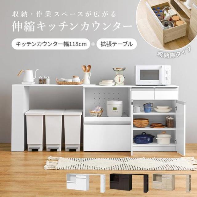 キッチンラック レンジ台 収納棚 伸縮式 幅133-207cm キッチンカウンター118cm 拡張テーブルセット