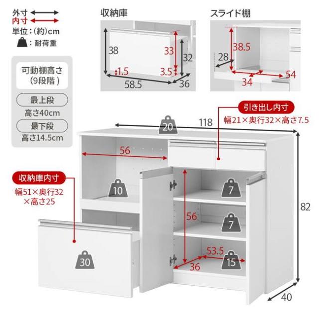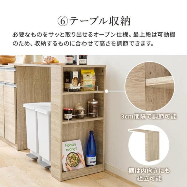 ●サイド収納は高さ調節が可能で調理器具や食器棚としてご使用頂けます