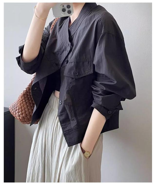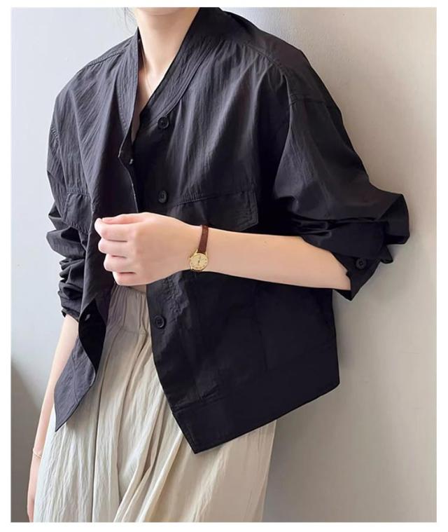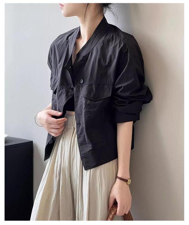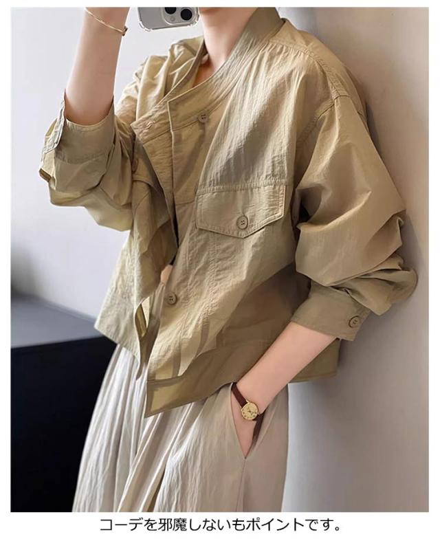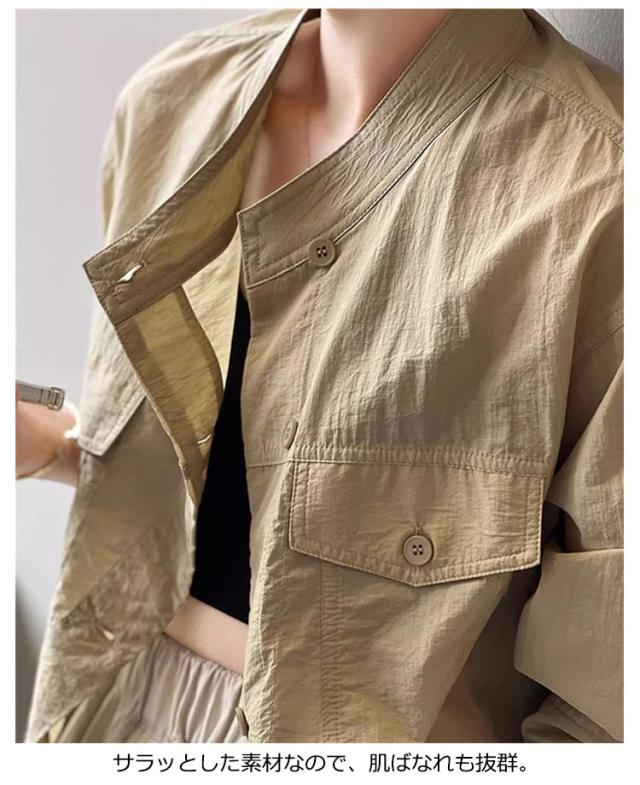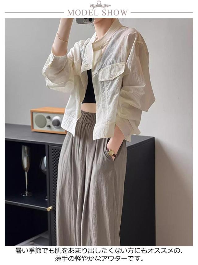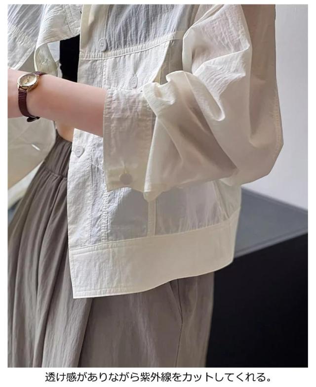 | 夏の冷房対策や日焼け対策に。 暑い季節でも肌をあまり出したくない方にもオススメの、 薄手の軽やかなアウターです。 シワ加工なので、シンプルなブルゾンにゆったり感が溢れる。 衿はスタンド仕様のバンドカラーなので 顔周りがスッキリ印象に。 優しいラウンドラインがデコルテをキレイ魅せ。 それに、全体は同じ素材を使用したので コーデを邪魔しないもポイントです。 透け感がありながら紫外線をカットしてくれる。 サラッとした素材なので、肌ばなれも抜群。 1枚着るだけで、紫外線対策ができる。 | |