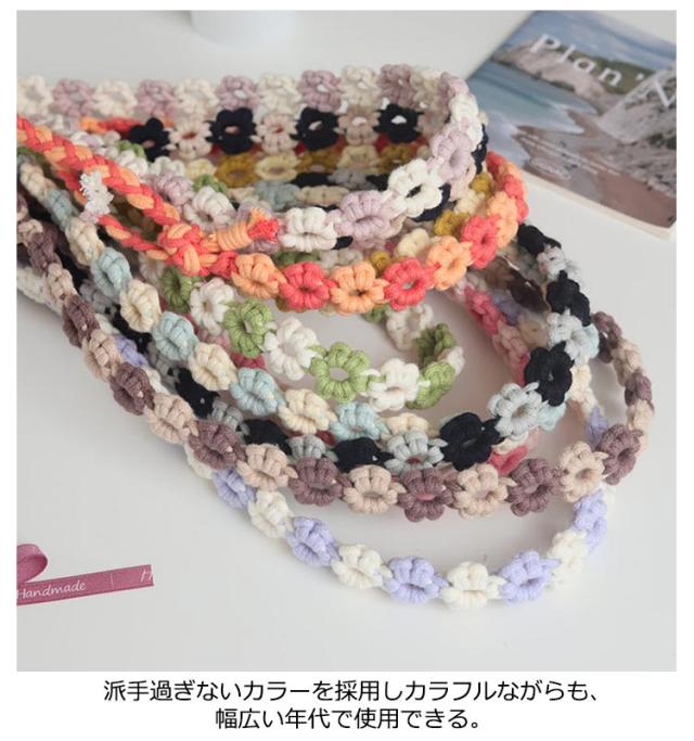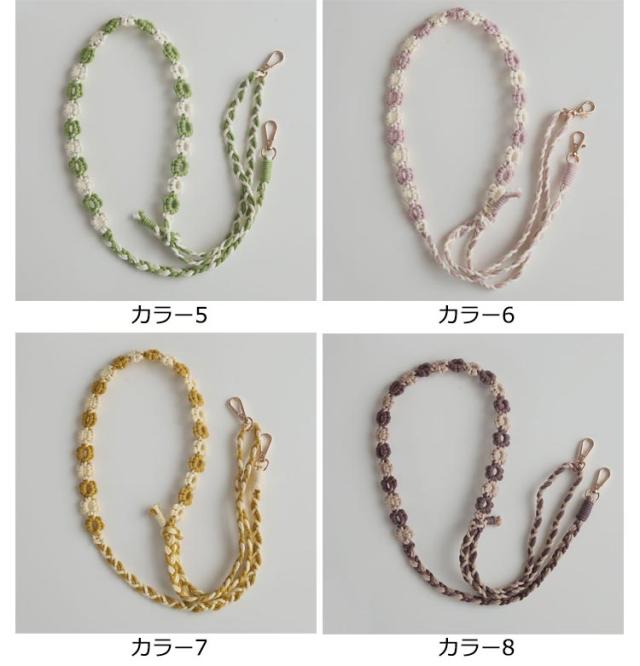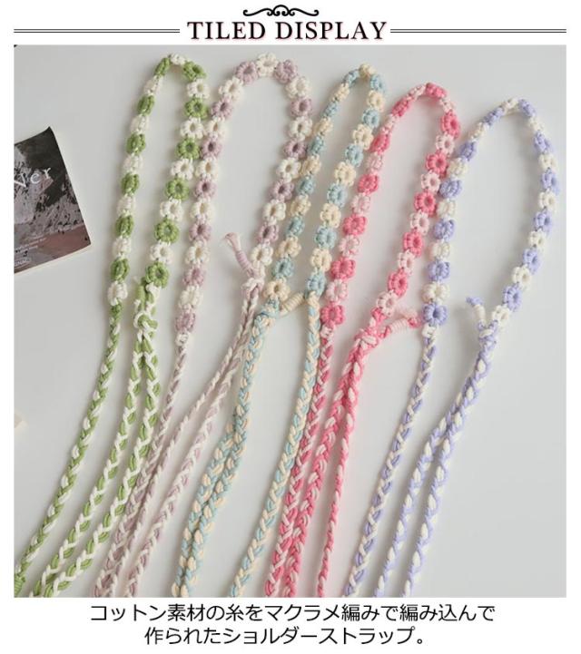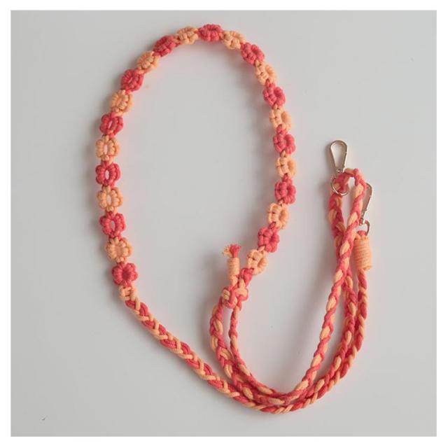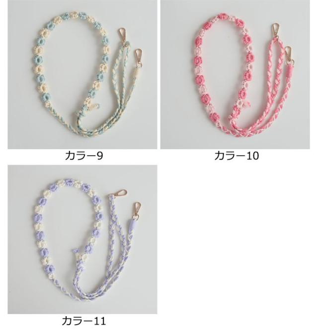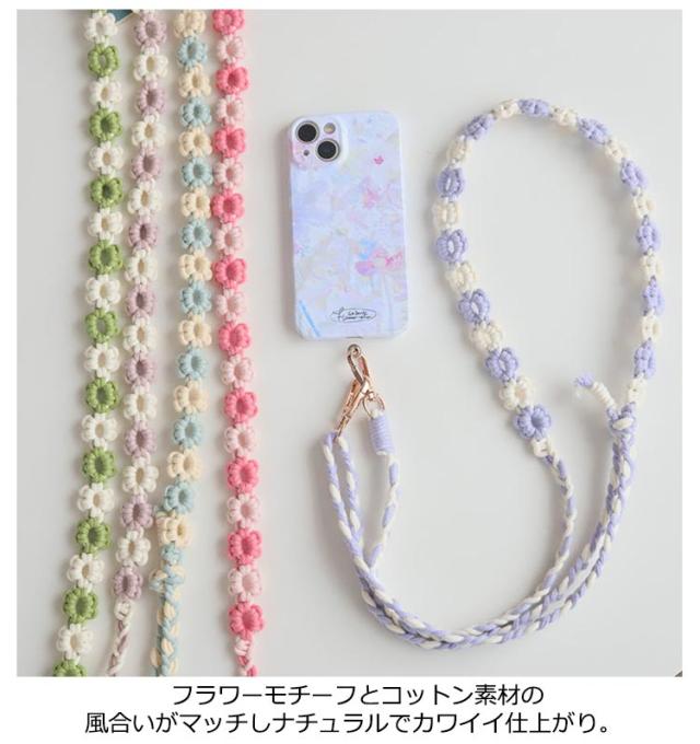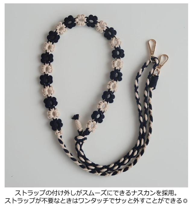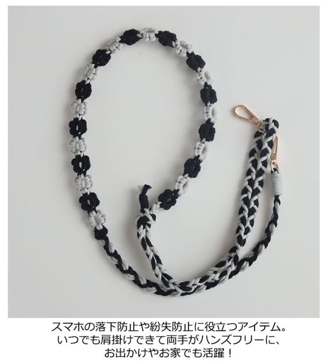 | 花の柄編みデザインがかわいいスマホ用ショルダーストラップ。 ポップな配色とコーディネートのアクセントになるデザインが魅力です。 両先端はフック式なので着脱も簡単。 太めのマクラメ編みなので肩への負担もかかりにくいデザイン。 スマートフォンだけを持ってお出かけしたいときに落とす心配もなく、両手も使えて便利です。 カジュアルなコーディネートのアクセントに、通年でお使いいただけます。 | |