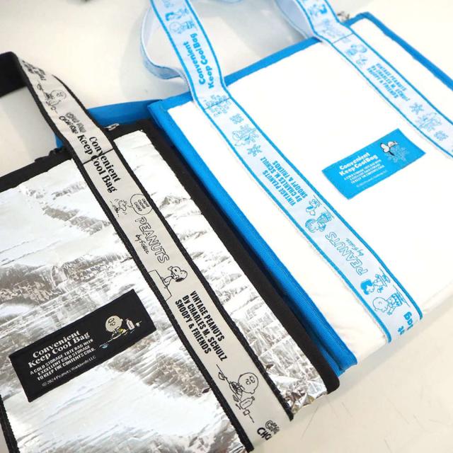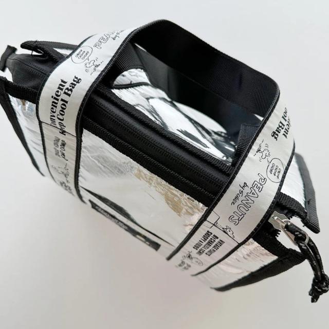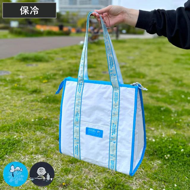 本体は無地、持ち手の織テープに部分にPEANUTSのアートが入った、シンプルなデザインの保冷トートバッグです。持ち手も長めで肩掛けしやすく、荷物を持ち運びしやすくなっています。