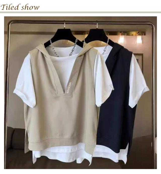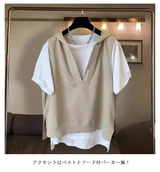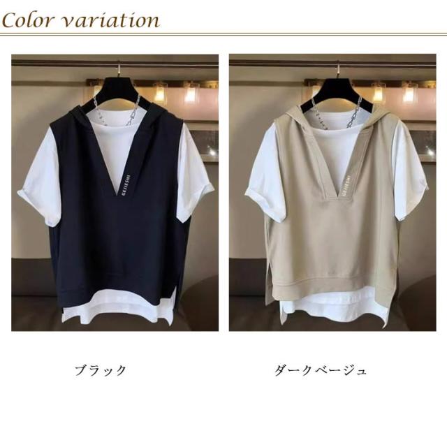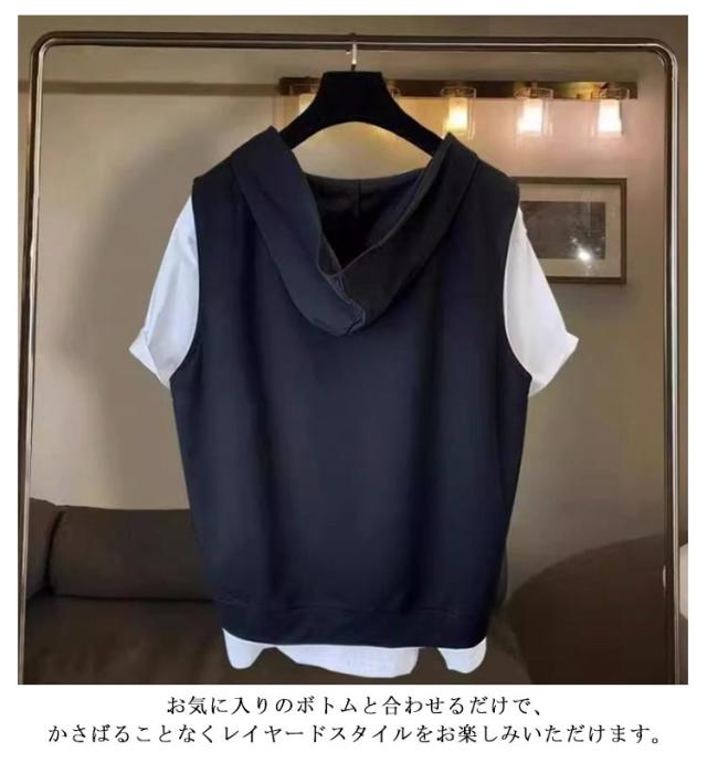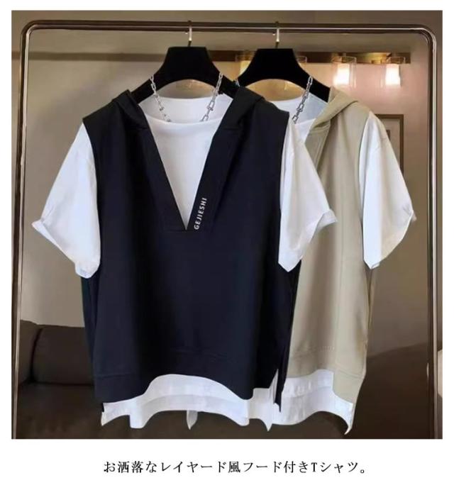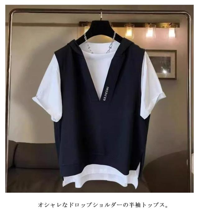 | 【M-8XL】【重ね着風Tシャツ】【フード付き】 お洒落なレイヤード風フード付きTシャツ。 オシャレなドロップショルダーの半袖トップス。 アクセントはベストとフード付パーカー風! お気に入りのボトムと合わせるだけで、かさばることなくレイヤードスタイルをお楽しみいただけます。 | |