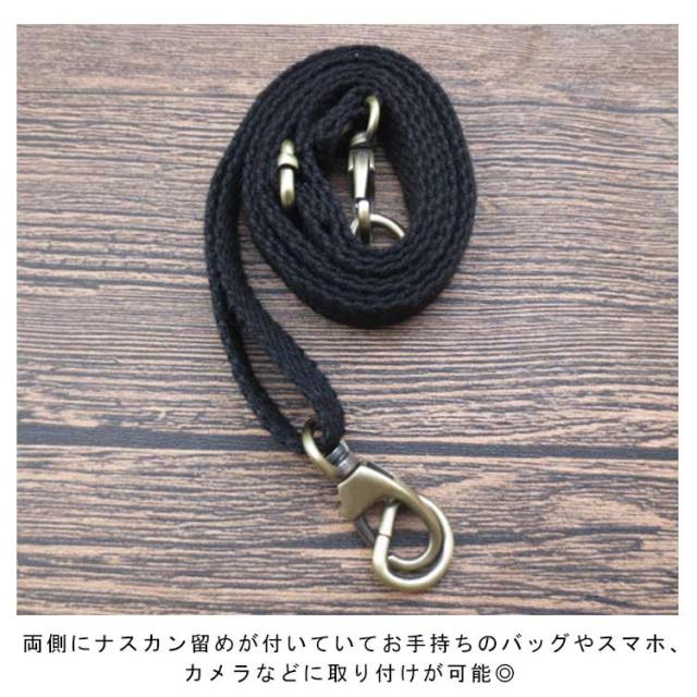 | 丈夫なキャンバス生地を使用したショルダーストラップです。 両側にナスカン留めが付いていてお手持ちのバッグやスマホ、カメラなどに取り付けが可能◎ 長さ調節ができて、ショルダーストラップとしても、ネックストラップとしてもお使いいただけます。 | |