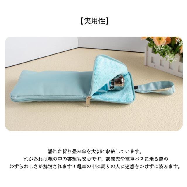 | 【超強い吸水性】内部は水分の吸収に優れたマイクロファイバーとシェニール織物素材が使われて、雨に濡れた傘の水分をしっかりと吸い取ってくれます。強い吸水性を持っています。 【防水ファスナー】防水ファスナーを採用されるので、吸収した水分が外側に滲み出てくることは絶対ありません。濡れた傘をしっかり密閉して水滴がちっとも漏れない 【実用性】濡れた折り畳み傘を大切に収納しています。れがあれば鞄の中の書類も安心です。訪問先や電車バスに乗る際のわずらわしさが解消されます!電車の中に周りの人に迷惑をかけずに済みます。 【収納が便利】使用後はカバーを開いてめくり、内側のマイクロファイバーを外側にし、吊して干して、よく乾燥させてください。 | |